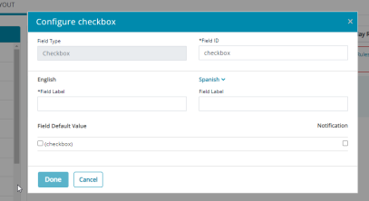The Configure checkbox form displays. You can customize the Field Labels in both English and Spanish. |