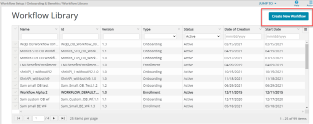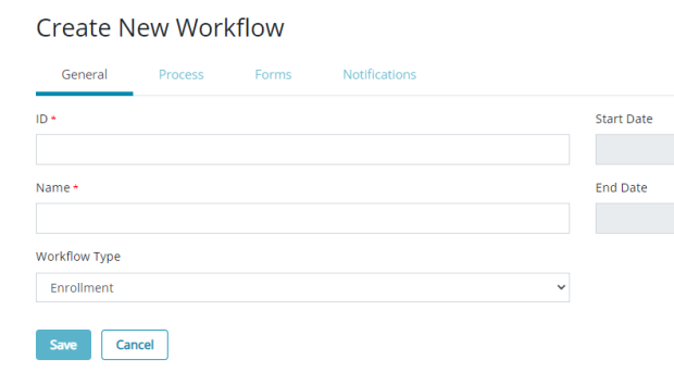 The Create New Workflow form displays. Enter the ID, Name, and Workflow type. |