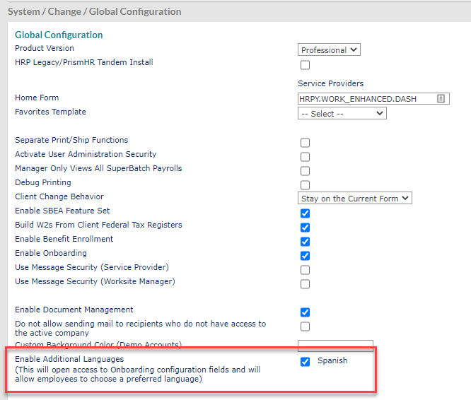 To enable Spanish, go to the Global Configuration form, and select the Enable Additional Languages field. |