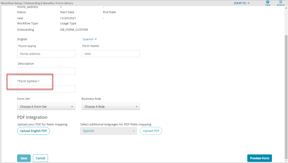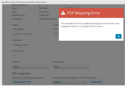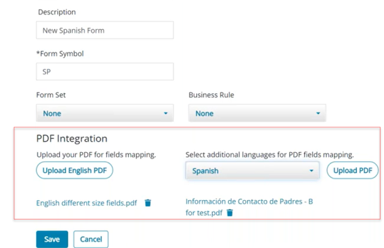In the PDF Integration section in the Form Library, you can upload English or Spanish PDFs. |