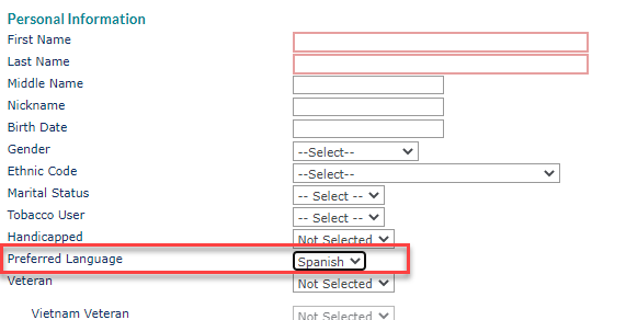 In the New Hire form, enter the required information and select Spanish in the Preferred Language field. |