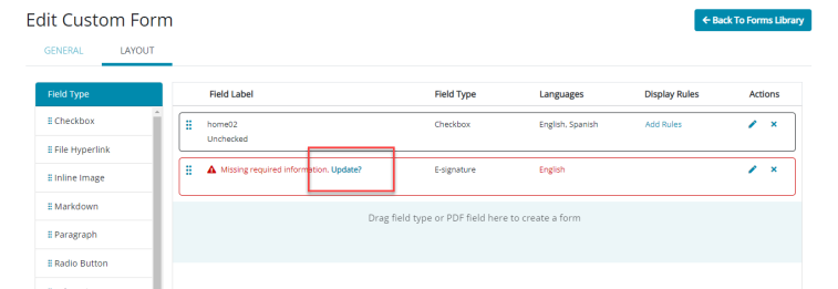 To edit a form, drag the form from the Field Type left column to the Field Label section on the right. |