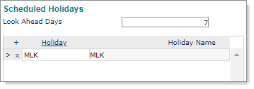 This setting displays if you set the register type Trigger Method to Holiday (see above). Use the Scheduled Holidays panel to ensure that the PTO register accrues holiday-based PTO at the appropriate time (determined by a "look ahead" period).