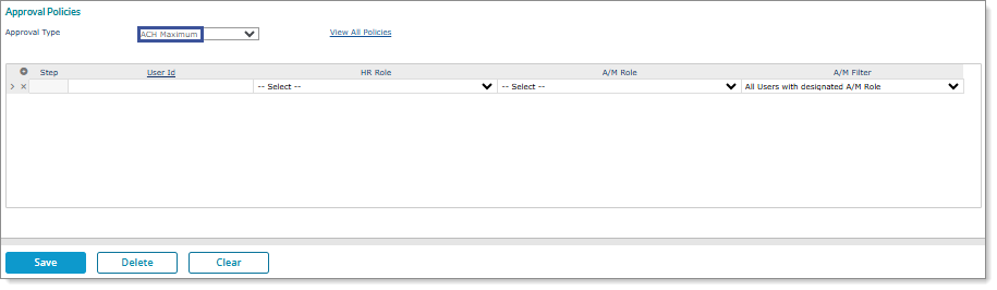 Note: Service providers who have Inquiry access to the Approval Policies and Global Approval Policies forms can view existing ACH Maximum Approval policies in read-only format and cannot make updates to the policy setup.