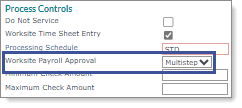 | • | Control tab on the Client Details form: Select Multistep in the Worksite Payroll Approval field. For example: |