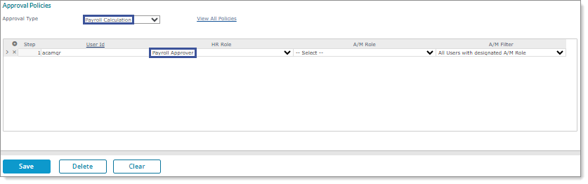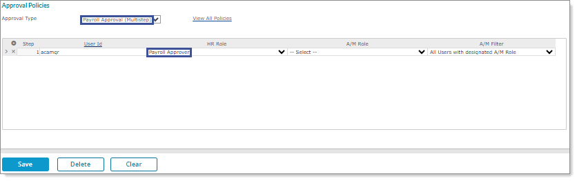 | • | After clicking Yes, the Approval Policies form displays. Configure a Payroll Approver for the Payroll Approval (Multistep) approval type. For example: |