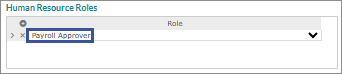 | • | Human Resource Roles panel on the Users form: Set up a Payroll Approver role for a worksite manager or worksite trusted advisor. For example: |